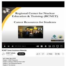 This video, from the Regional Center for Nuclear Education and Training (RCNET), features career information for students. The video's runtime is 37:23 and includes chapters on RCNET Resources, Writing an Effective Cover Letter, The Professional Resume, and The Interview. The video prepares students...