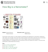 This lab, presented by the National Nanotechnology Coordinated Infrastructure, covers the concept of measurement on the nanoscale. During this exercise, students will learn about the size of a nanometer, converting between nanometers and other units of length, and giving examples of real life...