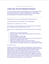 This 2-page activity, from the Advanced Technology Environmental and Energy Center, covers how aluminum is recycled. Special equipment, including a heat source capable of melting aluminum and an outdoor work area are required to complete the lesson. Extension activities are also provided.