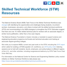 This website highlights work done by the National Science Board to explore the skilled technician workforce. The website includes reports, listening sessions, congressional activities, videos and media, and recordings of meetings. These resources identify opportunities and challenges facing ...