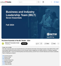 This video, provided by the National Information Technology Innovation Center (NITIC), features seven essential steps of the Business and Industry Leadership Team (BILT) curriculum development model, a process that aims to align curriculum with workforce needs through frequent meetings with...