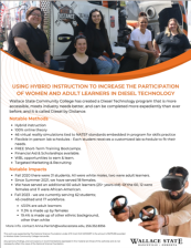 This resource includes two promotional flyers and one poster for Wallace State Community College-Hanceville's (WSCC) project aimed at increasing participation of women and adult learners in its diesel technician program. The first flyer and poster pertain to the implementation of hybrid instruction...