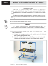 This lab activity from Amatrol, Inc. is related to the Solar Photovoltaic Installation and Troubleshooting Faculty Workshop that was held in summer 2022. During this lab activity, participants "... measure the voltage output of each photovoltaic module of the 20120 Mobile Solar PV Array (part of the...