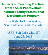 This 14-page paper, published by the American Society for Engineering Education, was presented at the 2018 ASEE Annual Conference and Exposition. The paper discusses the Solar Photovoltaic Institute for STEM Educators and the impacts the Institute had on the teaching practices of participants. The...
