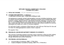 This 2-page syllabus includes information on the Introduction to Corrosion course taught at Seward County Community College (SCCC). This course provides an "introduction to internal, external, and atmospheric corrosion including terminology, causes of common corrosion problems in industry, and...