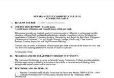 This 2-page syllabus includes information about the Cathodic Protection course taught at Seward County Community College (SCCC). This course offers "... an in-depth study of corrosion control of buried or submerged metallic structures utilizing both impressed and galvanic cathodic protection...