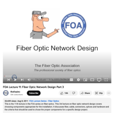 This video is the 11th lecture in the FOA series on fiber optics and the third lecture on fiber optic network design. This lecture covers choosing components appropriate for network installation. Fiber, cable, connectors, splices, and hardware are discussed. Running time for the lecture is 11:18...