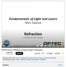 This lecture, presented by John Souders, covers the basics of refraction as the concept relates to the fundamentals of light and lasers. In 15 minutes, Souders defines refraction (the bending of a light wave when it passes from one medium to another) and describes the conditions necessary for...