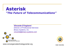 This presentation was created and presented by Vincente D'Ingianni, Director of Professional Services at Binary Systems, Inc. The presentation covers Asterisk, "a complete VoIP Softswitch, designed to reproduce the features of standard office PBX system," which allows interaction between these PBX...