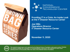 This presentation is provided by the National Convergence Technology Center (CTC) and was part of a special 30-minute "Brown Bag" webinar series. The presenation includes an overview of the technical logistics and challenges of the IT Disaster Resource Center (ITDRC), a non-profit that provides...