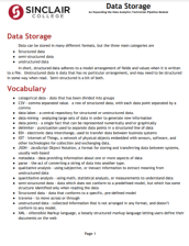 This document from Sinclair Community College explores data storage. Different storage formats are highlighted, including structured data, semi-structured data, and unstructured data. A data storage vocabulary, an activity, and information on extensions for the activity are also provided.