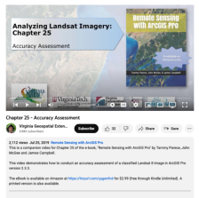 This video, provided by Virginia Geospatial Extension, is part of a series of 28 tutorial videos on remote sensing with ArcGIS Pro. This tutorial "demonstrates how to conduct an accuracy assessment of a classified Landsat 8 image in ArcGIS Pro version 2.3.3." This video runs 12:40 minutes in length....