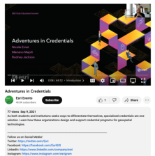 This video, from the 2021 Esri Education Summit, provides two presentations on credential programs for geospatial technologies. In the first presentation, Nicole Ernst from GeoTech discusses the Geospatial Science and Technology Educator Certification (GSTEdC) program. Ernst highlights the program's...