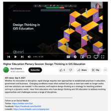 This video is from the Plenary session of the 2021 Esri Education Summit. The main topic of this session is design thinking in GIS education. This session explores "... design thinking as a strategy for teaching problem solving in a dynamic world." Viewers will "hear from educators who fuse design...