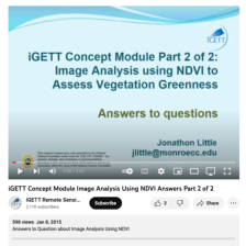 This video, created by Integrated Geospatial Education and Technology Training Project (iGETT), is the second part of a two part series on monitoring vegetation greeness with remote sensing. This video is a mini quiz that includes seven questions and answers. Questions include the following: What is...