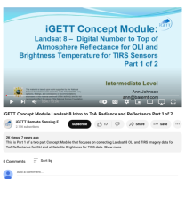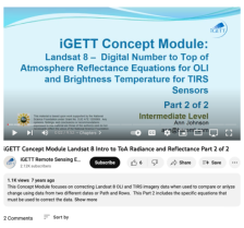 This video, from the Integrated Geospatial Education and Technology Training Project (iGETT), is the first of a two part concept module that focuses on correcting digital numbers (DN) for the two types of sensors on Landsat 8. The sensor Operational Land Imager (OLI) corrected to Top of Atmosphere...