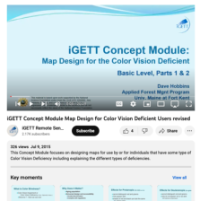 This video, created by Integrated Geospatial Education and Technology Training Project (iGETT), discusses designing maps for individuals who have some type of color vision deficiency. The video covers the following topics: what is color blindness, causes, classification, what does it matter, effects...