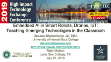 This presentation, made available by the University of Hawaii at Honolulu, provides information about teaching Artificial Intelligence (AI) and its use in Smart Robots, Drones, and the Internet of Things in a classroom setting. AI is defined as "a technique which enables machines to mimic human...