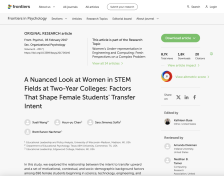 This 15-page article, published by Frontiers in Psychology, discusses a study on women STEM college students. This study "explored the relationship between the intent to transfer upward and a set of motivational, contextual, and socio-demographic background factors among 696 female students...