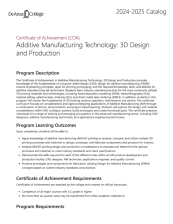This 2-page catalog description provides general information about the Additive Manufacturing Technology: 3D Design and Production certificate program offered by De Anza College. This program "... provides knowledge of the fundamentals of computer-aided design (CAD), design for additive...