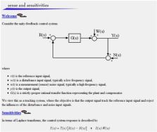A Java applet that illustrates the utility of the sensitivity and complementary sensitivity functions for linear control system design. Sketch a reference input and disturbance input with the mouse, and select a sensor noise level. Then drag open-loop system poles and zeros with the mouse to track...