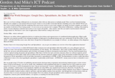 Gordon and Mike's ICT Podcast offers perspectives on the information and communication technologies (ICT) industries from Gordon Snyder and Mike Qaissaunee. In this podcast, Mike and Gordon discuss Google Docs, the digital media player Zune, and console gaming machines, XBox 360, PlayStation III,...