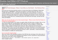 Gordon and Mike's ICT Podcast offers perspectives on the information and communication technologies (ICT) industries from Gordon Snyder and Mike Qaissaunee. In this podcast, Mike and Gordon discuss the proliferation of webware, such as Google Docs and Spreadsheets, GoogleFinance, and online office...