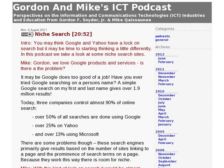 Gordon and Mike's ICT Podcast offers perspectives on the information and communication technologies (ICT) industries from Gordon Snyder and Mike Qaissaunee. In this podcast, Mike and Gordon talk about the niche search sites such as Spock and Wink. The running time for the show is 20:52.