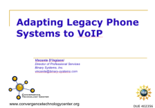 This slide deck was presented by Vincente D'Ingianni, Director of Professional Services at Binary Systems, Inc. The presentation covered how to adapt a Legacy phone system to Voice-over-Internet Protocol (VoIP). In the demonstration, D'Ingianni covers VoIP gateways, Bandwidth, Softswitches, and...