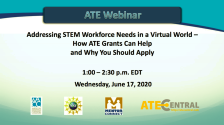 This webinar, made available by Florence-Darlington Technical College, provides information on Advanced Technological Education (ATE) grants and STEM workforce needs in a virtual world during the COVID-19 pandemic. The webinar is divided into the following sections: Introduction to the NSF ATE...