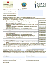 This 1-page document from Monroe Community College is a welding course competency evaluation form intended for assessing student abilities in either a welding course or during a job training activity. The form lists 13 competencies that instructors can rate from five to zero, with five denoting...