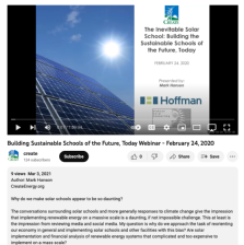 This webinar is presented by Mark Hanson and is based on Hanson's book The Inevitable Solar School: Building the Sustainable Schools of the Future, Today. During the webinar, Hanson "describes solar schools at or approaching zero energy that are being built at construction costs equal to or below...
