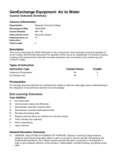 From the GeoExchange Initiative at Gateway Technical College, this Course Outcome Summary describes the GeoExchange Equipment: Air to Water course in which students learn "the components, heat exchange circuit and operation of an air to water GeoThermal heat pump." In addition to the course...