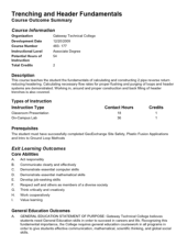 From the GeoExchange Initiative at Gateway Technical College, this Course Outcome Summary describes the Trenching and Header Fundamentals course, in which students learn "the fundamentals of calculating and constructing 2 pipe reverse return reducing headering" including calculating necessary flow...