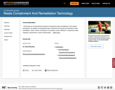This page is a course overview for Massachusetts Institute of Technology’s (MIT) course 1.34, Waste Containment and Remediation Technology. Selected lecture notes, assignments and their solutions, and exams are provided. Topics covered in the course include: introduction to and definition of...