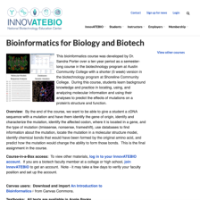 These five biotechnology courses, provided by InnovATEBIO, are designed to introduce biotechnology concepts at upper high school, technical, and lower undergraduate levels. Each course features a variety of modules and sub-modules that include quizzes, labs, worksheets, presentations, and other...