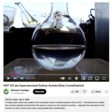 This short YouTube video, which runs for 0:26 was created by Dr. Michael Freudinger in 2008 to demonstrate the slow crystallization of super saturated sodium acetate. The description of the video provides an explanation for the reaction: "A single seed crystal was added to the saturated sodium...