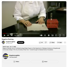 This video from CUNY Kingsborough Community College describes negative staining. The brief demonstration is described step by step and would be easy to replicate in a laboratory setting. Running time for the video is 1:32.