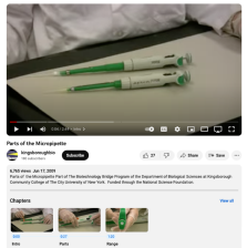 This video from CUNY Kingsborough Community College describes the parts of a micropipette. The demonstrator describes each part of the device and what it is used for. Running time for the video is 2:45.