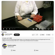 This video from CUNY Kingsborough Community College describes the process of pipetting. The brief demonstration is described step by step and would be easy to replicate in a laboratory setting. Running time for the video is 2:27.