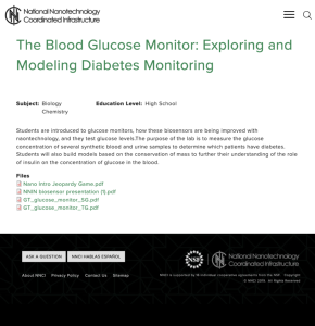 This lab, presented by the National Nanotechnology Coordinated Infrastructure, teaches students which patients, from a variety of samples, have diabetes. Students will measure "...the glucose concentration of several synthetic blood and urine samples..." This contains a 13-page teacher guide, that...