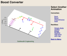 This animation, created by faculty at Dartmouth University, is a boost converter. The resource features other animations including buck and discontinuous converters. The site also depicts simple diode, bridge, and half-wave with cap rectifiers.