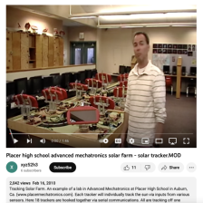 An example of a lab in Advanced Mechatronics at Placer High School. Each tracker will individually track the sun via inputs from various sensors. In this video, 18 trackers are hooked together via serial communications. All are tracking off one "master" while the others act as "slaves". Each tracker...