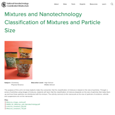 This resource, from the National Nanotechnology Coordinated Infrastructure, is a module that covers mixtures and nanotechnology. The main idea of this module is to introduce the idea to students that the classification of mixtures is based on the size of particles. Students will also be prompted to...