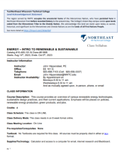 This 9-page syllabus and 9-page course outcome summary, published by Northeast Wisconsin Technical College (NWTC), provide information about the Intro to Renewable and Sustainable course taught at NWTC. This course provides students with an "overview of various renewable energy technologies,...