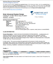This 16-page syllabus and 7-page course outcome summary, published by Northeast Wisconsin Technical College (NWTC), provide information on the Solar Advanced System Design course taught at NWTC. The course provides students with the opportunity "to further develop their knowledge, skills, process...