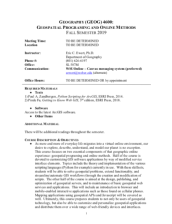 These resources include a 4-page syllabus and a 2-page course table map for the Geospatial Programming and Online Methods course taught at Weber State University. "Half of the course is devoted to customizing GIS software applications by way of modified service interface elements. Topics include the...