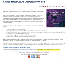 This webpage, from National Cybersecurity Training and Education (NCYTE) Center, is a course titled Critical Infrastructure Cybersecurity. The course introduces students to "basic security concepts as they apply to critical infrastructure systems." The course is available by way of e-book and...
