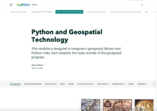 This resource, provided by the GeoTech Center, is the third of nine online modules in the Python and Geospatial Mapping course. The course is designed for experienced users of Global Information Systems (GIS) platforms who are new to programming, with the goal of teaching them how to use Python to...