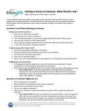 This one-page PDF from EvaluATE: Evaluation Resource Center for Advanced Technological Education provides guidance for ATE grant applicants on questions to ask a potential evaluator. Sample questions are shared, covering topics like evaluator qualifications, background, and skills, compatibility...